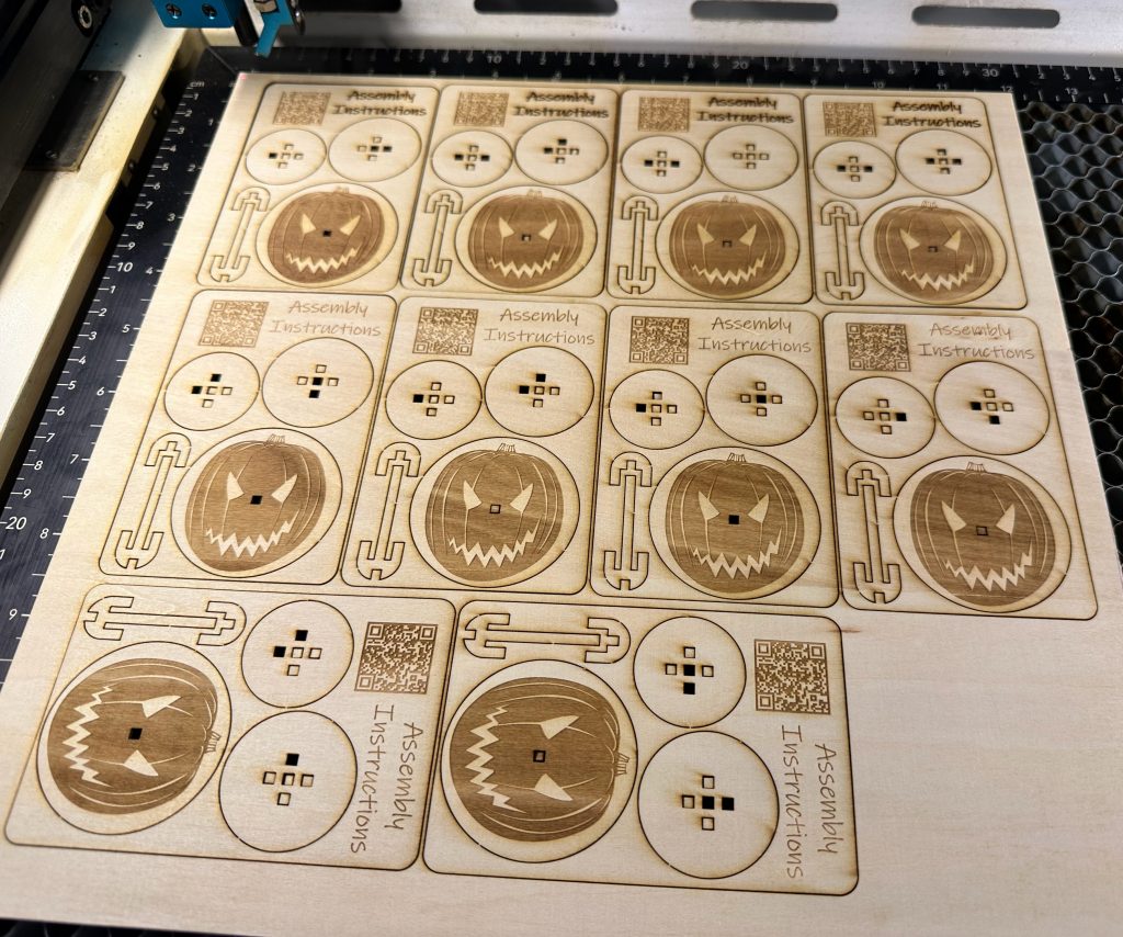 I then wanted to make a kit, and initially I edited the paths in lightburn to make little gaps in each of the outlines to make “tabs.” This is great for a file to share, but it was also easier to use the generate tabs feature in lightburn. The last thing was to add a QR Code linking to the assembly video.
